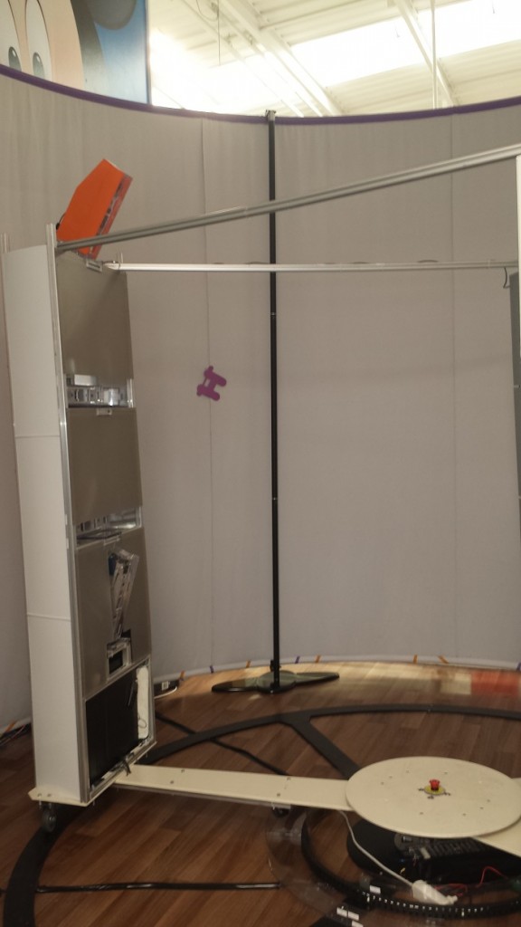 Once you step inside you stand in the middle of the contraption which then spins around you on the circular rail you can see at the bottom of the image. Staying still and focusing on the purple dot on the wall, the device spins around you taking lots of pictures and scanning you to understand the shape of you;